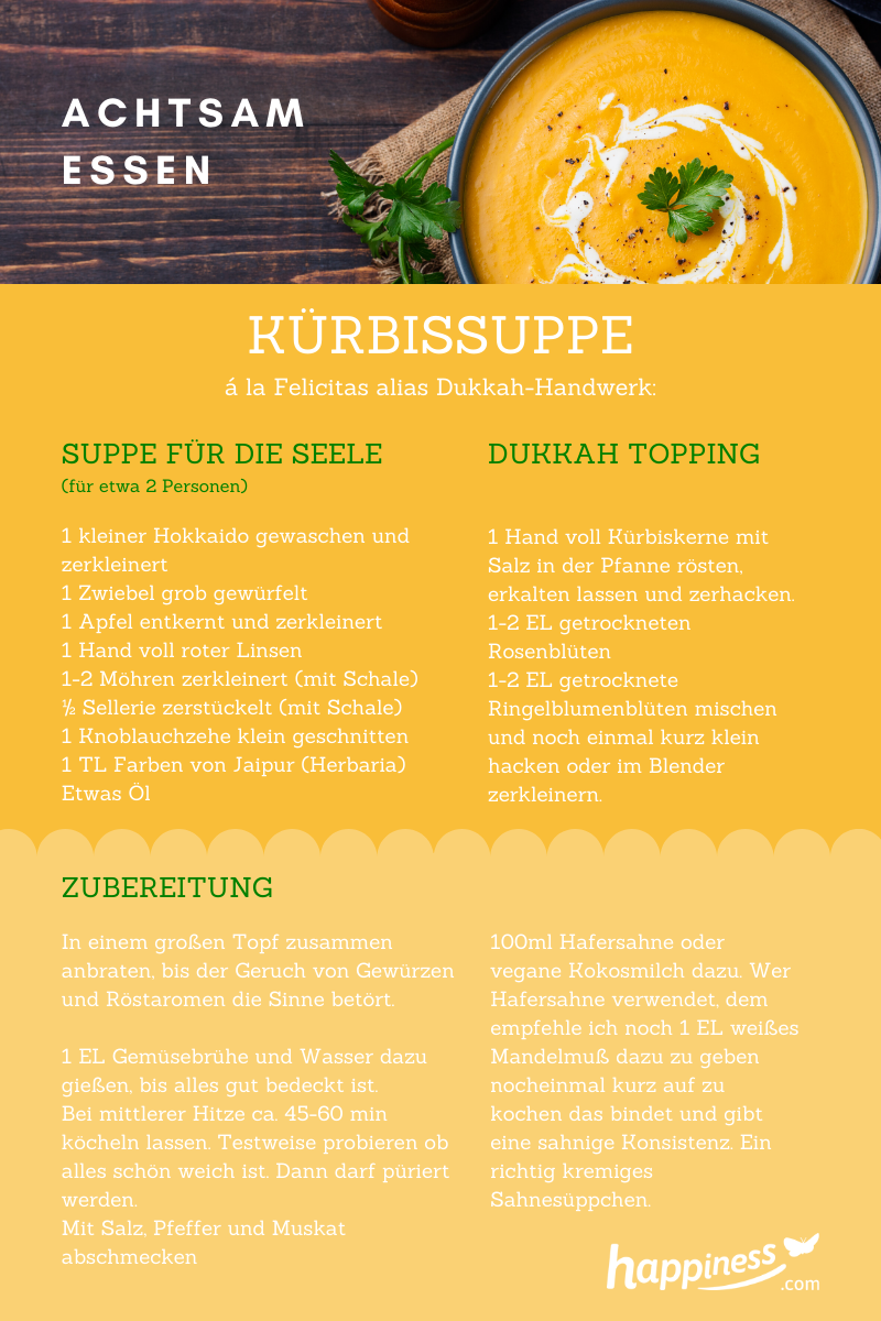 Und wenn es draußen so richtig kalt und ungemütlich ist, lädt dich diese Kürbissuppe ein, sie und mit Genuss zuzubereit und achtsam zu essen:
